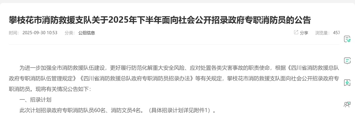 原标题:攀枝花市消防救援支队关于2025年下半年面向社会公开招录政府专职消防员的公告