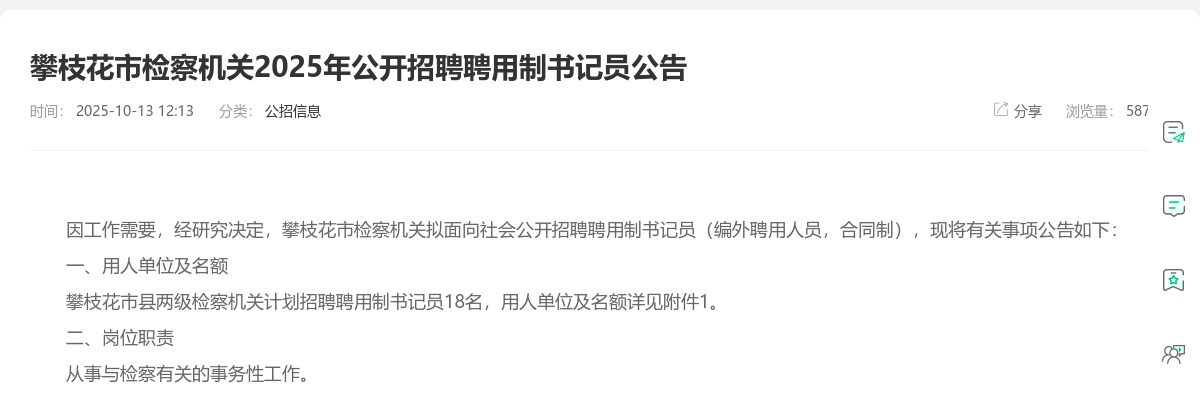 原标题:攀枝花市检察机关2025年公开招聘聘用制书记员公告