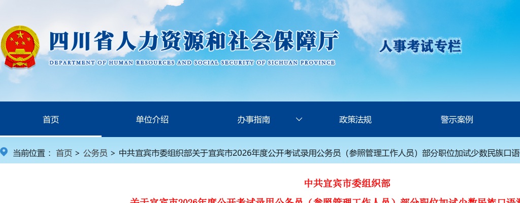原标题:中共宜宾市委组织部关于宜宾市2026年度公开考试录用公务员(参照管理工作人员)部分职位加试少数民族口语测试的公告