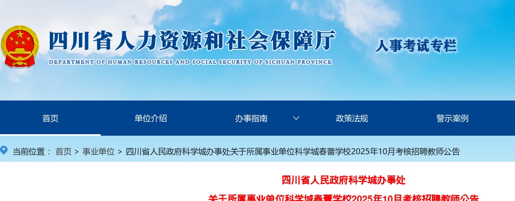 原标题:四川省人民政府科学城办事处关于所属事业单位科学城春蕾学校2025年10月考核招聘教师公告