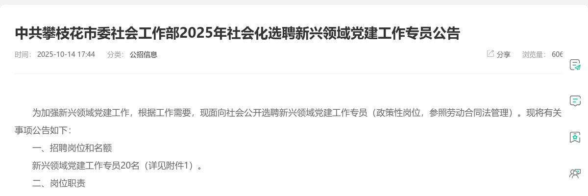 原标题:中共攀枝花市委社会工作部2025年社会化选聘新兴领域党建工作专员公告