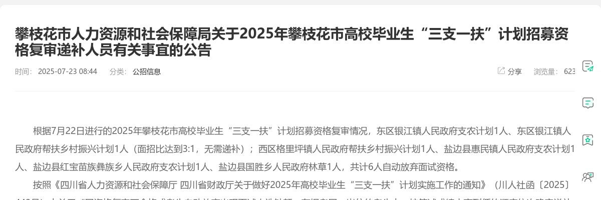 - 2025年攀枝花市高校毕业生“三支一扶”计划招募资格复审递补人员有关事宜的公告